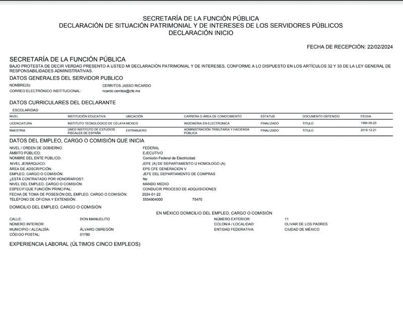 Adrián Olvera contrató, en febrero de 2024, en su área de trabajo -vamos, la que él dirige- ni más ni menos que al mismísimo esposo de Emilia Calleja, de nombre Ricardo Cerritos Jaso, quien, dicho sea de paso, no cuenta con experiencia alguna para laborar en la CFE. No obstante el nepotismo, Adrián le otorgó un salario alto, superior al de la mayoría.