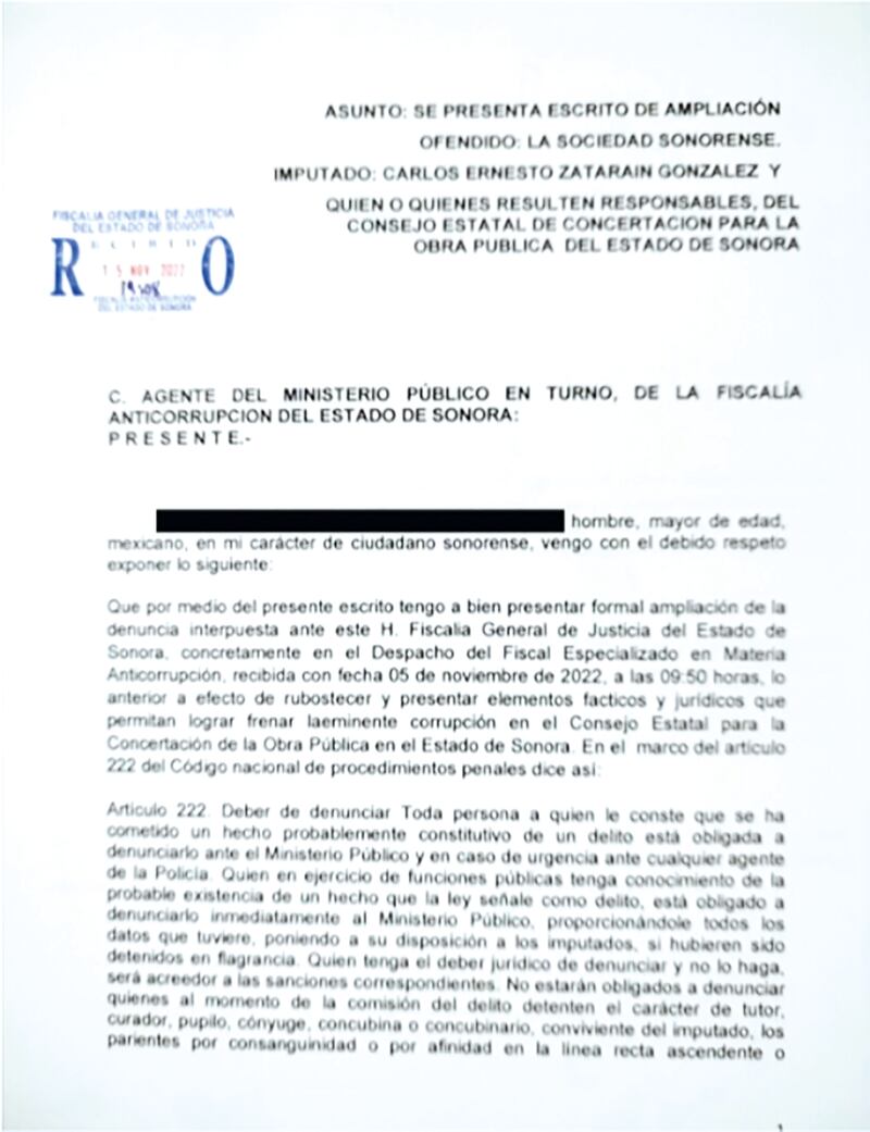 Denuncia en contra de Zatarain González por actos de corrupción.