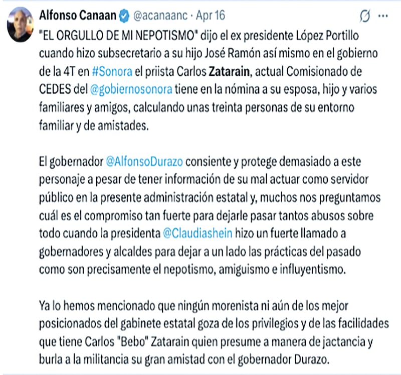 En Guaymas, la trayectoria de Zatarain es ampliamente conocida y pocas veces por motivos honorables. Entre ellos, su nepotismo: su esposa, Judith Nungaray Beltrán, fue incorporada como subcoordinadora de programas en el CECOP a la salida de Zatarain, y su hijo mayor, Jorge Carlos, funge como coordinador de Administración y Finanzas en la oficina de Durazo. ¡Así como están leyendo!