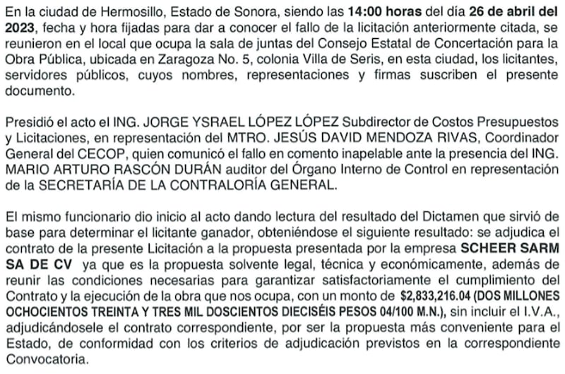 El fallo se publicó el 26 de abril de 2023, apenas dos días después de la salida de Zatarain de la dependencia, en lo que parece un intento de mantener las formas y evitar señalamientos directos. En otras palabras, todo el proceso de licitación se llevó a cabo mientras Zatarain encabezaba el CECOP y el fallo se dio, convenientemente, luego de éste abandonar la dependencia.