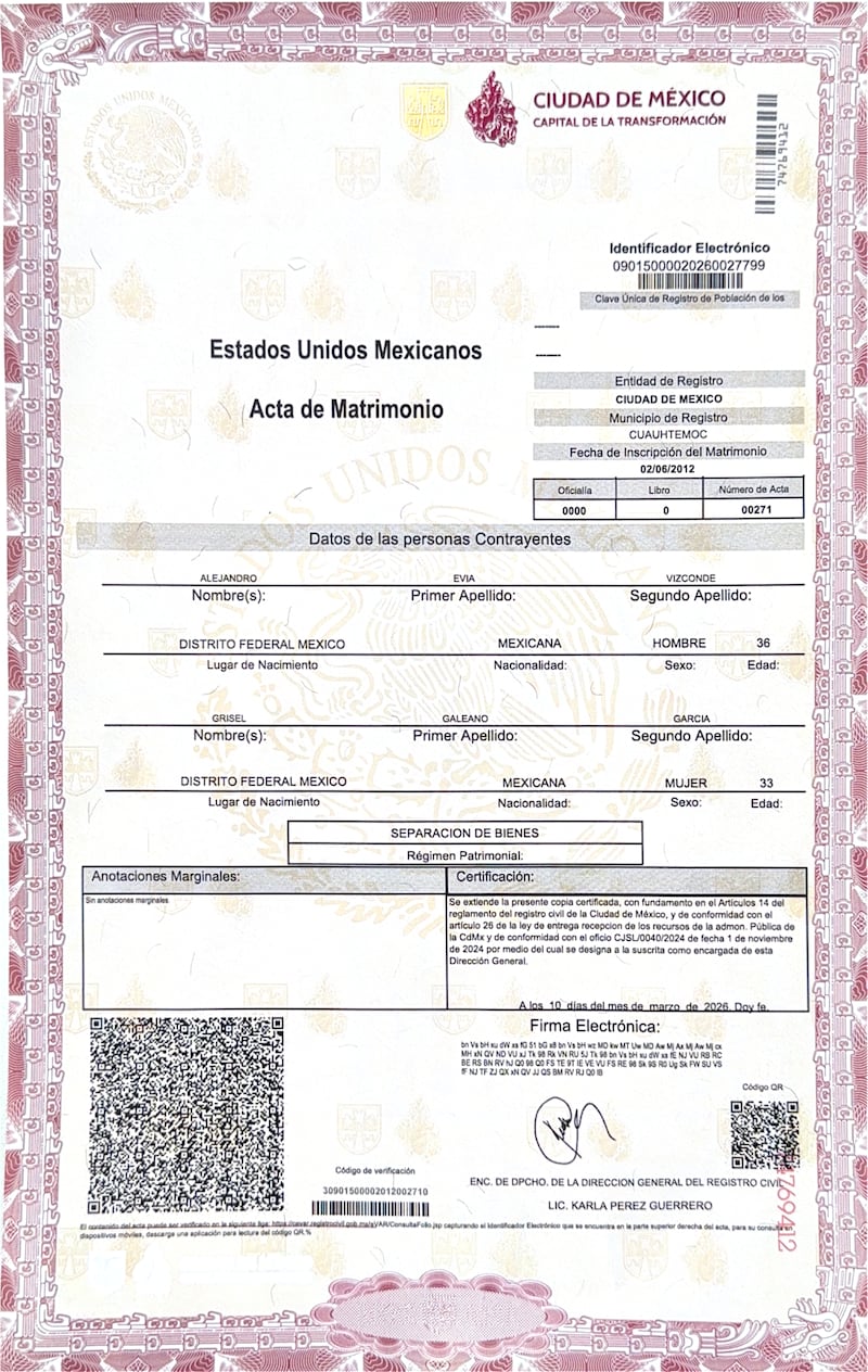Resulta que la esposa de Alejandro Evia Vizconde no es una abogada cualquiera -redoble de tambores-: es, ni más ni menos, que la procuradora fiscal de la Federación, Grisel Galeano García. ¿Cómo les quedó el ojo? ¡Cuadrado! Este matrimonio es un hecho. Así se desprende del acta de matrimonio, inscrita el 2 de junio de 2012, número de acta 00271. En aquellos ayeres, Alejandro Evia tenía 36 años y Grisel Galeano, 33 años.