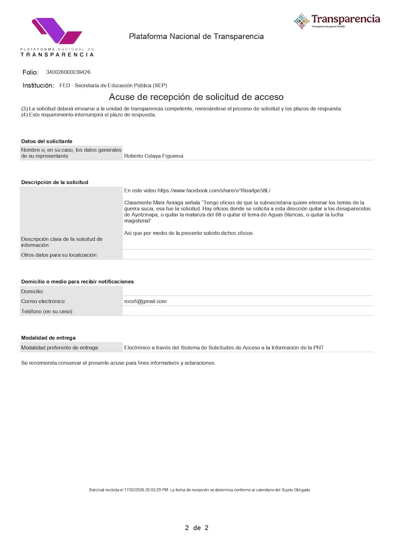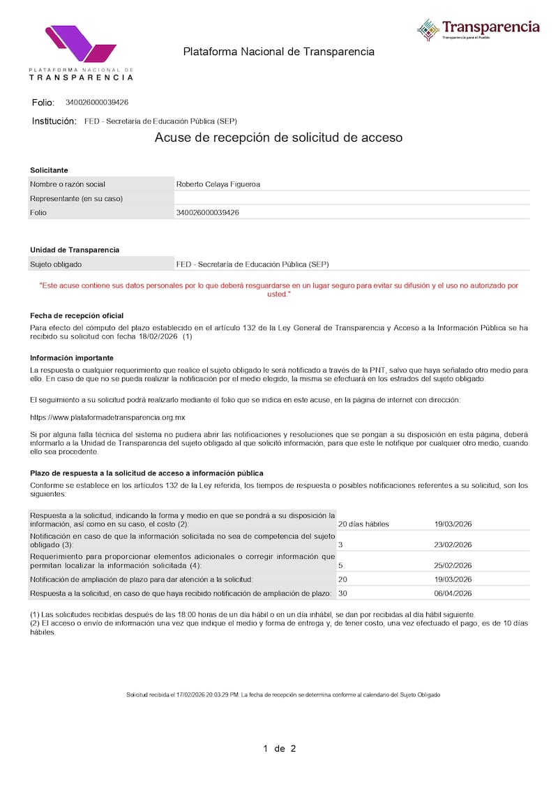 Por eso solicitamos, vía transparencia (folio 340026000039426), la totalidad de esos “oficios” que Arriaga dijo tener. La respuesta de la Unidad de Transparencia de la SEP, fechada el 6 de abril de 2026, es un tiro de gracia a su versión: