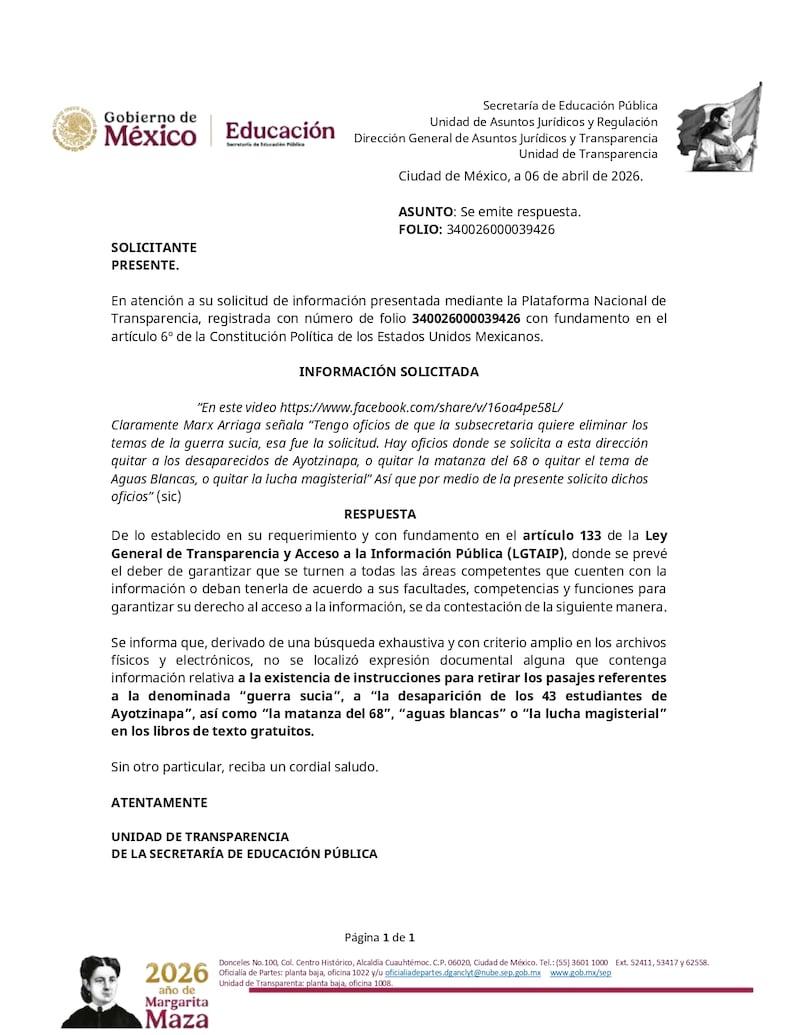 “Derivado de una búsqueda exhaustiva y con criterio amplio en los archivos físicos y electrónicos, no se localizó expresión documental alguna que contenga información relativa a la existencia de instrucciones para retirar los pasajes referentes a la denominada “Guerra Sucia”, a “la desaparición de los 43 estudiantes de Ayotzinapa”, así como “la matanza del 68”, “aguas blancas” o “la lucha magisterial” en los libros de texto gratuitos”.
