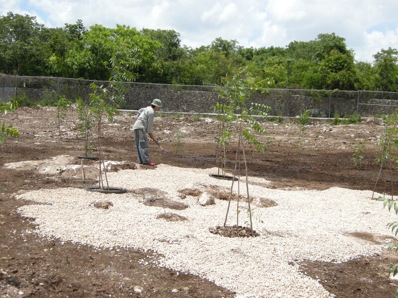 La pieza consiste en un espacio en donde árboles donados y sembrados puedan proporcionar sombra a los alumnos de la escuela. Tarea titánica en donde la maestra Gruber literalmente puso las semillas y regó—personalmente por años—en el calor sofocante de Yucatán cada uno de los ahora árboles.
